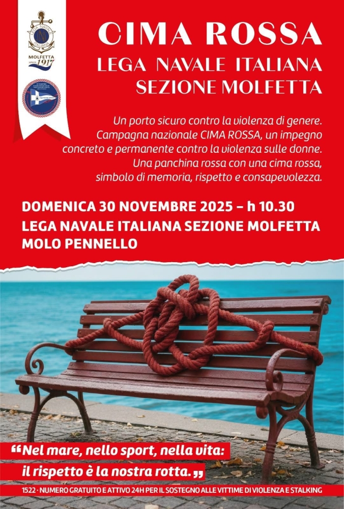 MOLFETTA - “Un porto sicuro contro la violenza di genere” è il titolo dell’iniziativa promossa alla Lega Navale Italiana Sezione di Molfetta. Domenica 30 novembre, alle 10.30, nella sede dell’associazione, nei pressi del Molo Pennello, verrà inaugurata una panchina rossa simbolo di responsabilità e speranza, per dire “Stop!” ad ogni forma di violenza. Prosegue, così, l’impegno della Lega Navale Italiana – Sezione di Molfetta inserito nella campagna nazionale “Cima rossa” promossa dalla Presidenza della Lega Navale Italiana e dedicata, appunto, alla prevenzione e al contrasto della violenza sulle donne. Un gesto semplice, un messaggio chiaro attraverso cui far sentire anche la voce della città adagiata sul mar Adriatico che dell’acqua e dello sport è da sempre grande alleata.