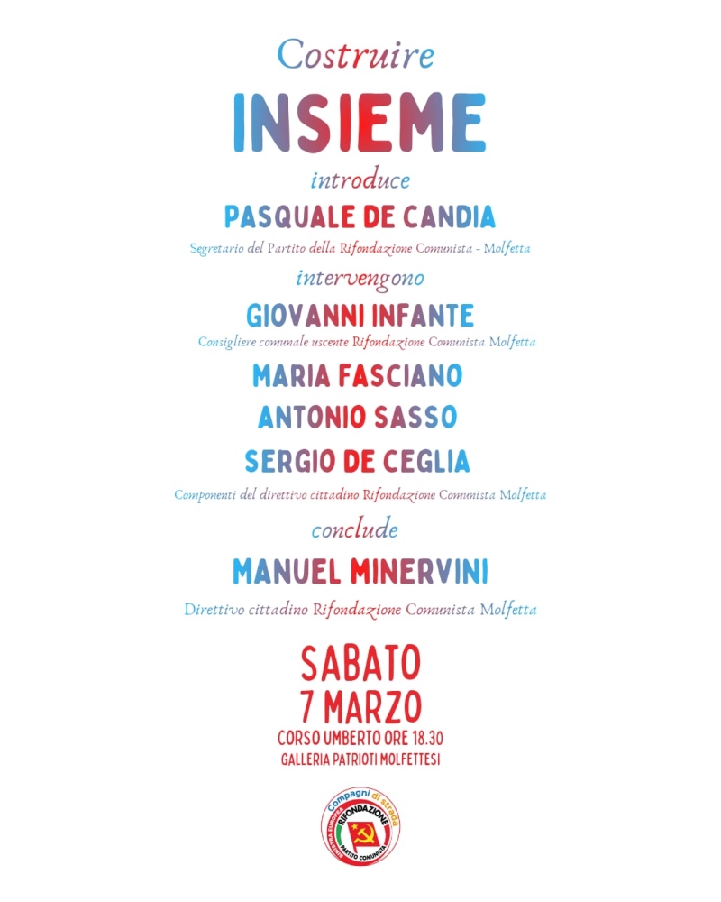 MOLFETTA - Sabato pomeriggio alle ore 18.30, il circolo locale di Rifondazione Comunista ritorna in piazza per l'iniziativa pubblica "Costruire insieme" che si terrà al Corso Umberto, altezza Galleria Patrioti Molfettesi.