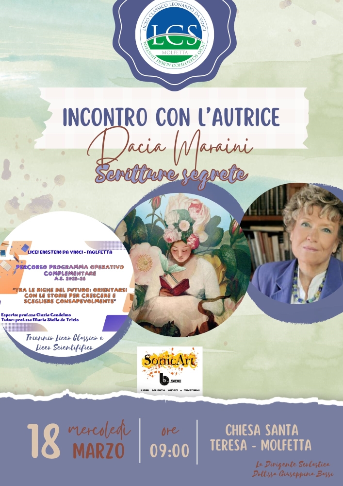 MOLFETTA - Mercoledì 18 marzo 2026, presso la Chiesa di Santa Teresa a Molfetta, gli studenti dei Licei “Einstein - Da Vinci” avranno l’opportunità di incontrare Dacia Maraini, una delle voci più autorevoli della letteratura italiana contemporanea.