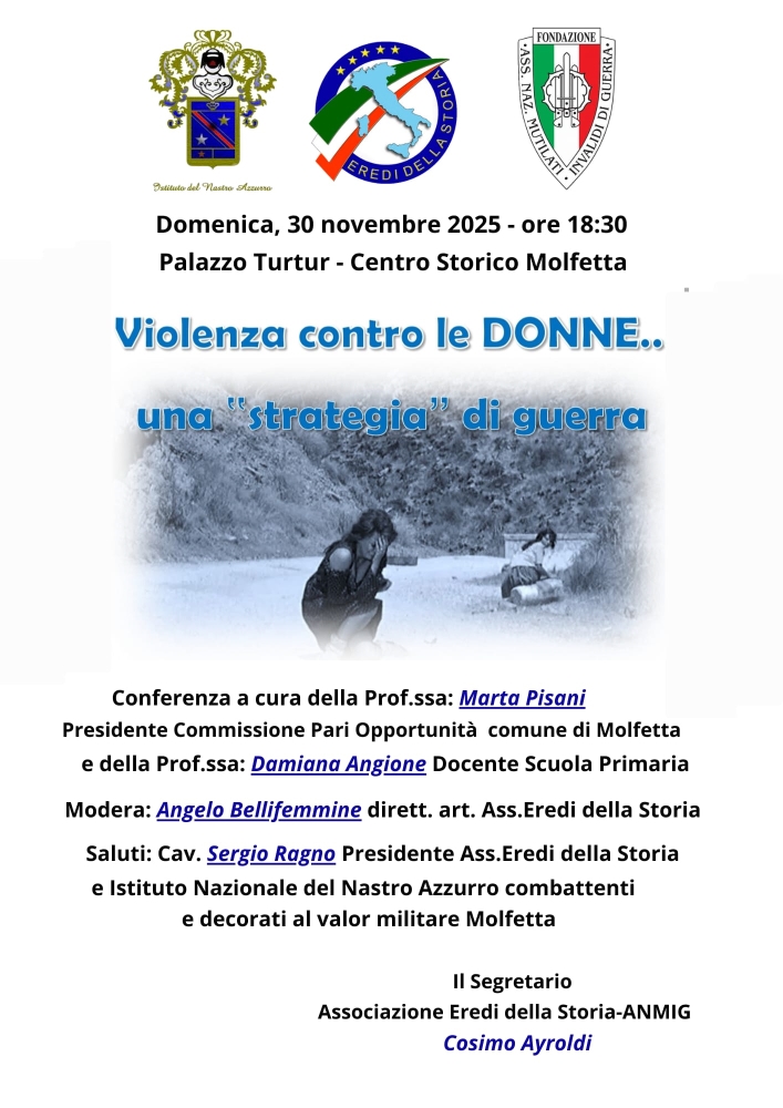 Domenica 30 novembre, alle 18 e 30 presso la sede del Museo Storico “Dal Regno delle Due Sicilie alla Repubblica”, sito presso Palazzo Turtur in via Preti a Molfetta, si terrà una conferenza dal titolo: “Violenza contro le donne… una strategia di guerra”.