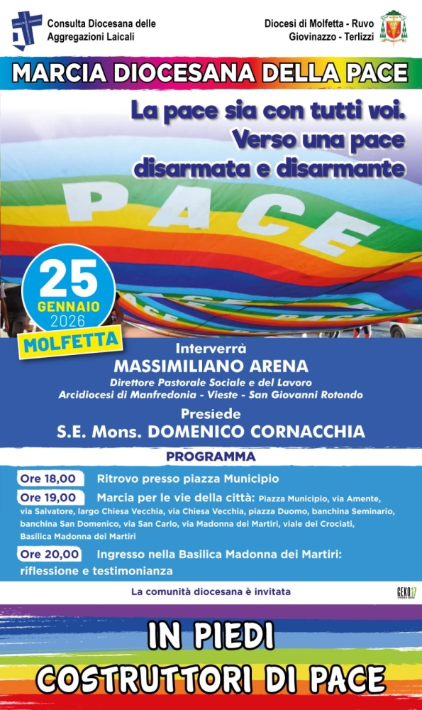 MOLFETTA - Domenica 25 gennaio torna a Molfetta la tradizionale Marcia Diocesana della Pace. “La pace sia con tutti voi. Verso una pace disarmata e disarmante” il titolo di questa undicesima edizione. In questo tempo segnato dai conflitti e in cui i diritti umani e il diritto internazionale vengono calpestati, la Chiesa diocesana si ritroverà per invocare la pace e testimoniare i valori della nonviolenza, della democrazia, della giustizia, della fraternità universale.