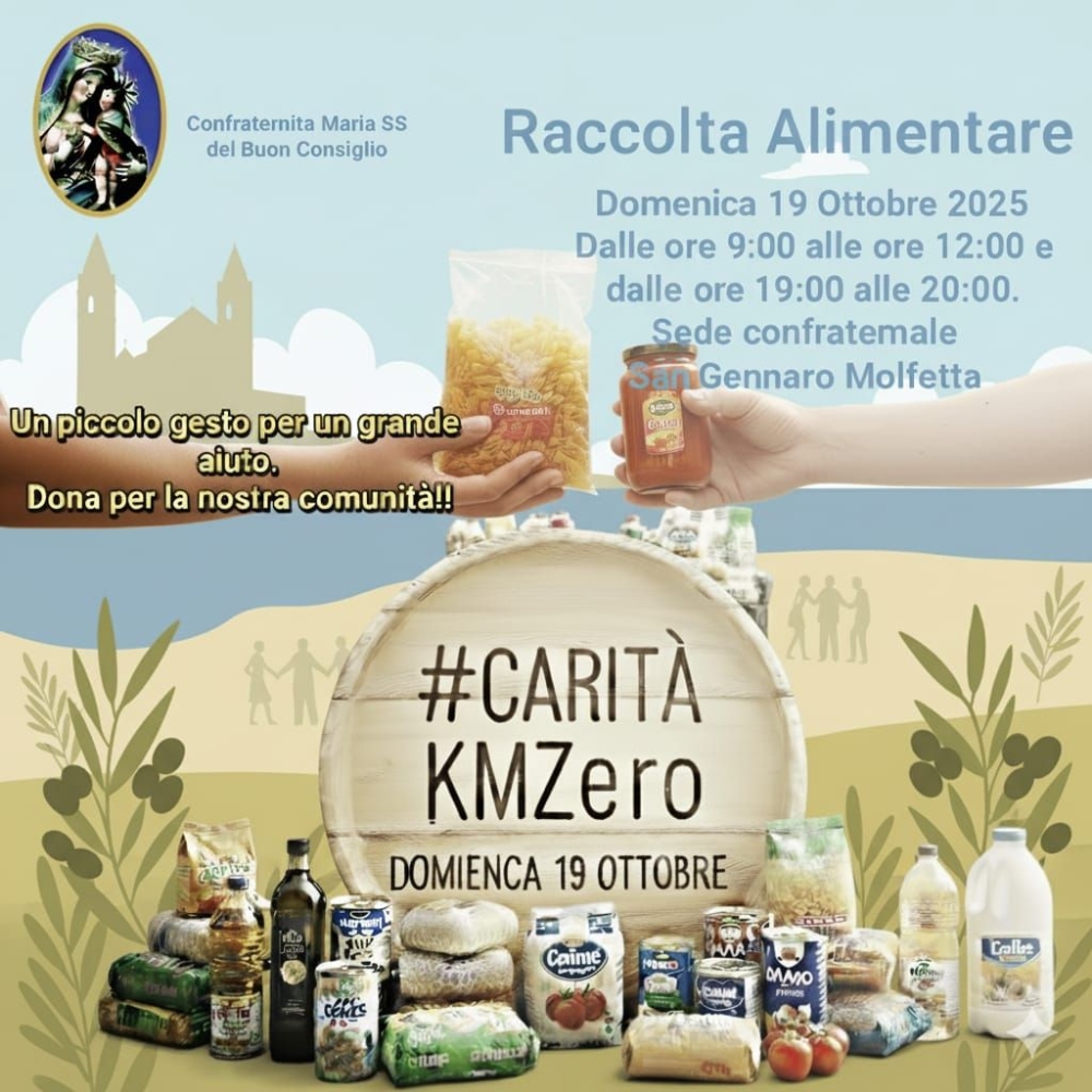 - Questa settimana, l'attenzione del mondo è rivolta ai temi della fame e della povertà in occasione della Giornata Mondiale dell'Alimentazione (16/10) e della Giornata contro la Povertà (17/10). La Confraternita Maria SS. del Buon Consiglio della Parrocchia di San Gennaro di Molfetta vuole trasformare questa consapevolezza globale in un'azione concreta per la nostra comunità, invitando a una raccolta alimentare straordinaria: un gesto, un aiuto mirato. I generi alimentari raccolti saranno interamente consegnati al Gruppo Parrocchiale di San Gennaro di Marta e Maria, il quale provvederà alla distribuzione mirata alle persone e alle famiglie che ne hanno effettivamente bisogno sul nostro territorio. In questa Domenica della Solidarietà, la Confraternita invita attivamente a una catena di aiuto che parte dal nostro cuore e arriva direttamente alla tavola di chi è in difficoltà. L'appuntamento principale è: QUANDO: Domenica 19 Ottobre 2025 (Domenica della Solidarietà) ORARIO: Dalle 9:00 alle 12:00 ORARIO SERALE: Dalle 19:00 alle 20:00 DOVE: Presso la nostra sede confraternale. --- OPZIONE AGGIUNTIVA --- Per chi fosse impossibilitato a venire Domenica: DONAZIONE ANTICIPATA: Venerdì 17 Ottobre ORARIO: Dalle 19:00 alle 20:30 Gli Alimenti per la Dispensa Solidale (Si accettano solo generi a lunga conservazione) Ogni pacco che lascerete nel "