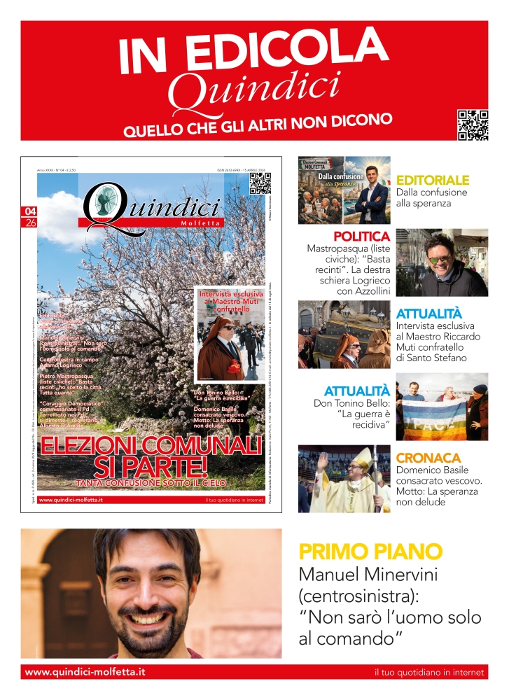 E’ in edicola il numero di aprile del mensile “Quindici” con l’intervista in esclusiva al Maestro Muti e le notizie sulle coalizioni delle elezioni comunali. Mons. Basile consacrato vescovo di Molfetta