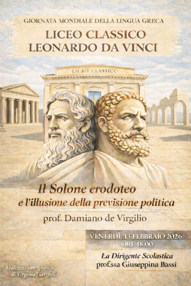 Venerdì 13 febbraio 2026, alle ore 18, nella Sala Biblioteca dell’Istituto, si terrà la conferenza dal titolo: “Il Solone erodoteo e l’illusione della previsione politica”. La lezione, aperta alla cittadinanza, sarà tenuta dal prof. Damiano De Virgilio, docente di Lingua e Letteratura Greca presso il Liceo Classico “Leonardo da Vinci”.