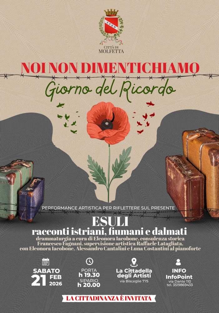 MOLFETTA - Sabato 21 febbraio alla Cittadella degli Artisti di Molfetta, in occasione del Giorno del Ricordo, va in scena alle ore 20 Esuli. Racconti istriani, fiumani e dalmati, una produzione del Teatro Stabile d'Abruzzo, che invita a riflettere sul presente attraverso la forza della memoria. L’iniziativa, che vede il patrocinio del Comune di Molfetta, nasce dall’esigenza profonda di conservare e rinnovare la memoria della tragedia che ha colpito gli italiani e tutte le vittime delle foibe, nonché del drammatico esodo degli istriani, fiumani e dalmati nel secondo dopoguerra, all’interno della più complessa e dolorosa vicenda del confine orientale.