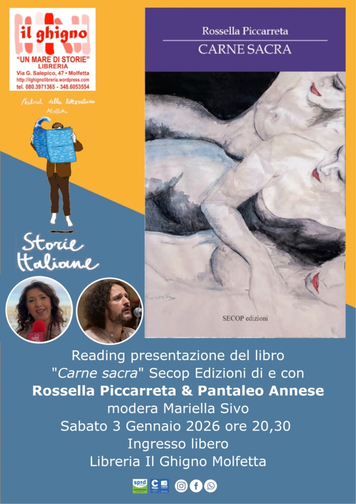 Sabato 3 gennaio 2026 ore 20,30 spazio al reading presentazione del libro” Carne sacra” di Rossella Piccarreta Secop Edizioni con la partecipazione di Pantaleo Annese & Mariella Sivo, ingresso libero.