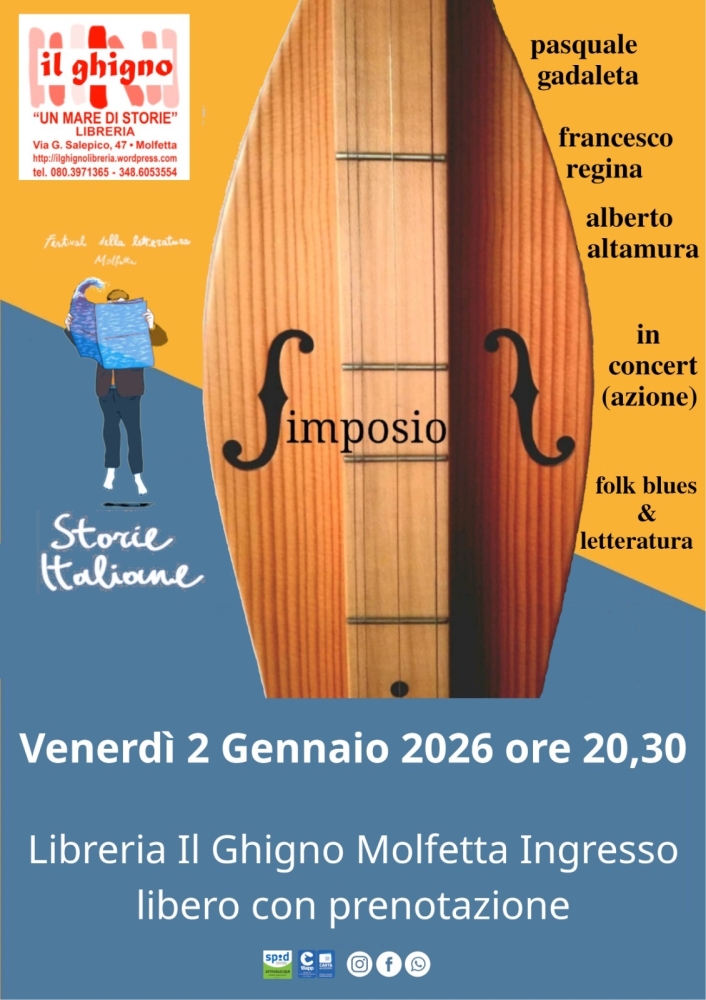 Venerdì 2 gennaio 2026 ore 20,30 Simposio: musica, libri e filosofia per “Storie Italiane Festival winter edition” nel salotto della Libreria Il Ghigno di Molfetta.