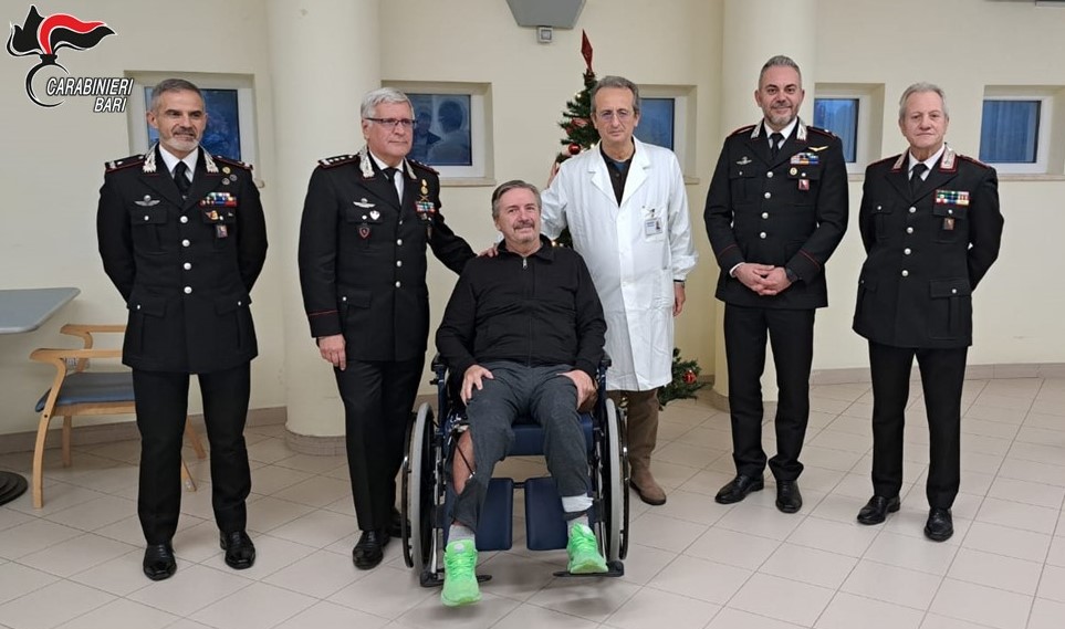 Il Comandante Interregionale si è recato presso il Centro di Riabilitazione Frangi di Acquaviva delle Fonti, per verificare il prosieguo delle cure riabilitative e porgere il suo saluto e i migliori auspici, anche in occasione delle prossime festività natalizie, al Luogotenente in quiescenza Carlo Piazzolla, rimasto ferito nel corso del grave evento delittuoso.