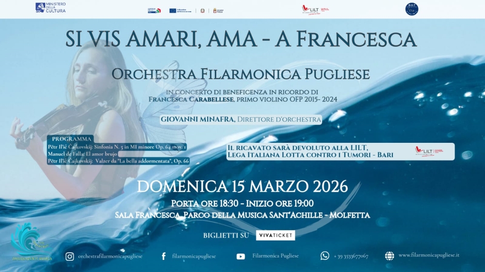 MOLFETTA - Quando a suonare è il cuore, la musica può farsi ricordo prezioso. Appuntamento con l’Orchestra Filarmonica Pugliese a Molfetta, domenica 15 marzo alle 19 (ingresso alle 18:30), nell’accogliente sala Francesca del Parco della Musica “Sant’Achille”, per “Si vis amari, ama”, dedicato alla violinista Francesca Carabellese, scomparsa due anni fa. Il ricavato dei biglietti, disponibili su Vivaticket, andrà in beneficenza alla LILT per la lotta contro i tumori.