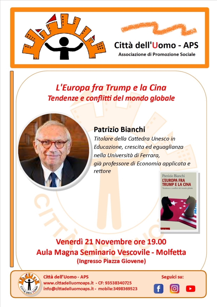 Città per l’uomo di Molfetta si confronterà su questi temi venerdì 21 novembre nell’Aula Magna del Seminario Vescovile con il Prof. Patrizio Bianchi per la presentazione del libro dal titolo “L’Europa tra Trump e Cina".