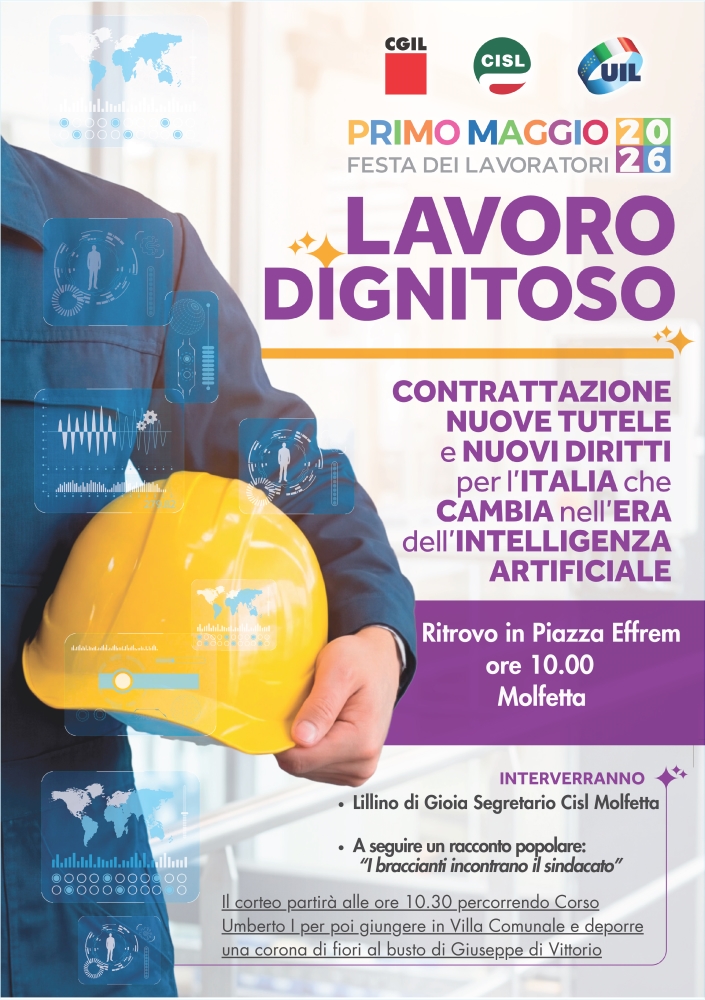 – In occasione della Festa dei Lavoratori, le sigle sindacali CGIL, CISL e UIL di Molfetta annunciano la manifestazione cittadina per il 1° Maggio 2026. Al centro della giornata, il tema cruciale del lavoro dignitoso e la necessità di una contrattazione capace di generare nuove tutele e nuovi diritti per un’Italia che cambia velocemente sotto l'impulso dell’intelligenza artificiale. L’appuntamento per la cittadinanza, i lavoratori e le lavoratrici è fissato per le ore 10.00 presso Piazza Effrem a Molfetta, nei pressi della stazione.