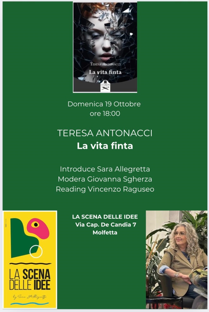 MOLFETTA - Parte l’attività autunnale de La Scena delle Idee con un nuovo straordinario appuntamento e ospita la presentazione del romanzo La vita finta di Teresa Antonacci, ed. Les Fl?neurs, domenica 19 ottobre 2025, ore 18.