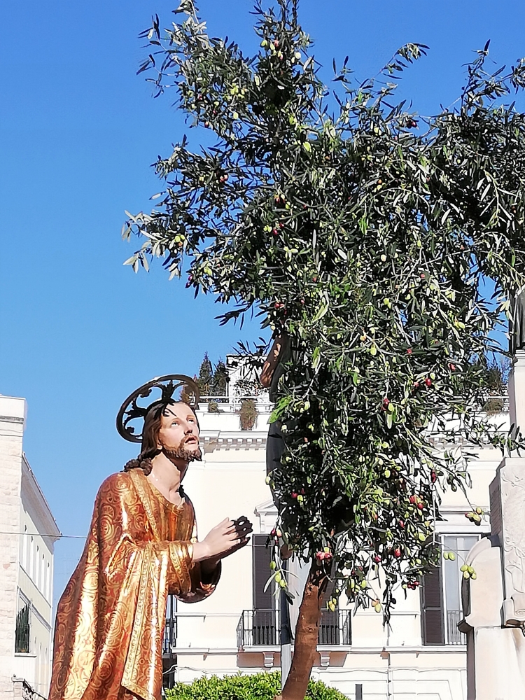 Non si tratta di folklore residuale, ma di strutture simboliche che danno forma all’identità collettiva. La processione del Venerdì Santo e il Vexilla regis A Molfetta, la processione del Venerdì Santo è detta anche dei cinque Misteri: Si tratta di cinque statue lignee rappresentanti la Passione di Cristo, dotate di grande realismo. La statue sono oggi concordemente datate alla seconda metà del XVI secolo, con una possibile estensione ai primissimi anni del Seicento, di origine e scuola napoletano-campana. La tradizione locale ne ha a lungo sostenuto una provenienza veneziana — leggenda suggestiva, probabilmente connessa ai traffici marittimi e ai rapporti commerciali con la Serenissima — ma allo stato attuale non esistono documenti che ne attestino tale provenienza. In assenza di contratti di committenza o firme, l’attribuzione rimane prudenzialmente riferita a una bottega dell’Italia meridionale tra la fine del Cinquecento e l’inizio del Seicento, più che a una specifica scuola veneziana. Tuttavia, esse rappresentano un esempio emblematico di stratificazione storica. Le statue sono caratterizzata da accentuato pathos espressivo, naturalismo drammatico, intensa teatralità devozionale e grande realismo. Durante la processione, esse avanzano lentamente per le strade della città alle prime luci dell’alba, tra una folla di persone che osservano in religioso silenzio. Il