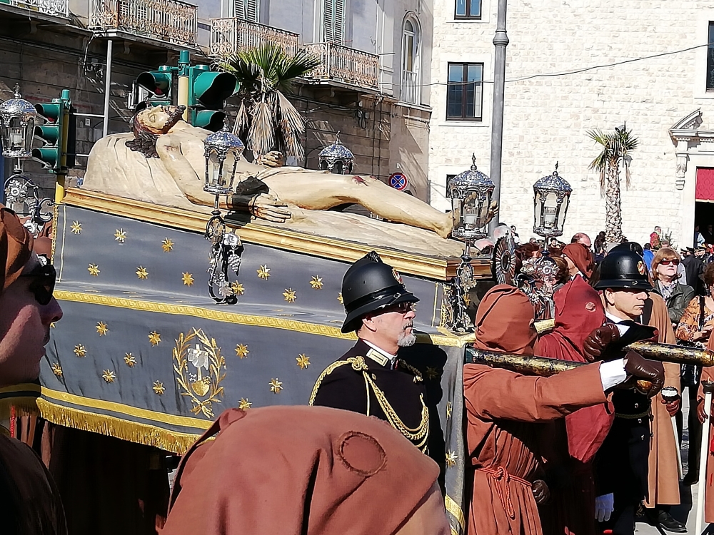 : Dio regnò dalla croce! La città assiste muta, rapita a questa dialettica visiva e sonora. La morte è esibita; la vittoria è proclamata. Le note della banda cittadina, che eseguono le famose Marce funebri molfettesi, fanno da cornice emotiva e sfondo naturale alla lunga processione dalle lente e cadenzate movenze. Le conferiscono un andamento tragico, percepito, quasi avvertito nella viva carne, a significare una sacra rappresentazione che si ripropone, immutabile nel tempo. Il dolore è rappresentato; la sovranità è affermata. Il catafalco stesso, elevando il corpo del Cristo morto, lo sottrae alla pura dimensione funeraria e lo espone come segno pubblico che si può quasi toccare. La morte non è nascosta: è mostrata, ritualizzata, quasi solennizzata. Dal punto di vista antropologico, siamo di fronte a un meccanismo di trasformazione del lutto in identità. La comunità non rimuove la morte del proprio fondatore; la ritualizza. La rende centro del proprio racconto. Attraverso il canto, il gesto e perfino il colore — si pensi all’Arciconfraternita di Santo Stefano dal sacco rosso, con il loro saio marrone, simbolo di penitenza, e il rosso del loro sacco, simbolo insieme di sangue, regalità e martirio: ecco che il trauma si fa fondamento. La processione del Sabato Santo e la compassione collettiva Il giorno seguente, nella processione del Sabato Santo, con le sette statue in cartapesta dello scultore molfettese Giulio Cozzoli, la dimensione patetica si accentua ancor di più. Il dolore della Madre, il corpo deposto di suo figlio che ella accoglie esangue tra le sue braccia, sulle ginocchia, la croce che le fa da sfondo: tutto questo simboleggia la compassione collettiva. Anche qui, i confratelli dell’Arciconfraternita della Morte, con saio, mozzetta e cappuccio completamente nero, portano la statua della Pietà con una lentezza misurata, rituale, e intonano ancora una volta il