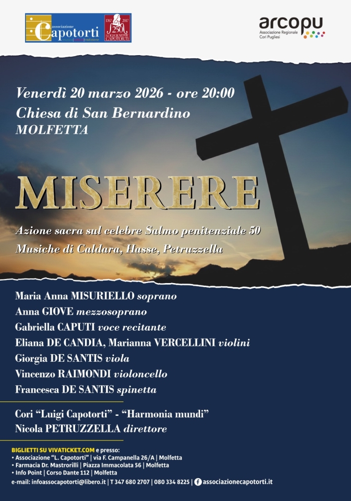 MOLFETTA - Venerdì 20 marzo, alle ore 20, nella suggestiva cornice della Chiesa di San Bernardino, il pubblico è invitato a vivere un’esperienza di intensa spiritualità e profonda emozione con “MISERERE”, azione sacra sul celebre Salmo penitenziale 50.