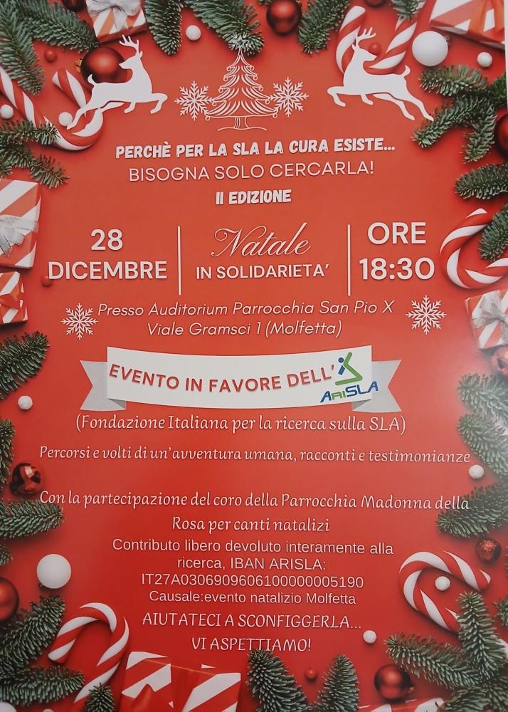 MOLFETTA - “Il 28 dicembre, alle ore 18.30, presso l’Auditorium Parrocchia San Pio X, si terrà l’evento in favore della Fondazione italiana di ricerca per la sclerosi laterale amiotica (AriSLA). Sarà concentrata sul tema della SLA, che rappresenta una grande sfida sia per i pazienti e le loro famiglie sia per le istituzioni, i centri di riferimento ospedalieri e territoriali.