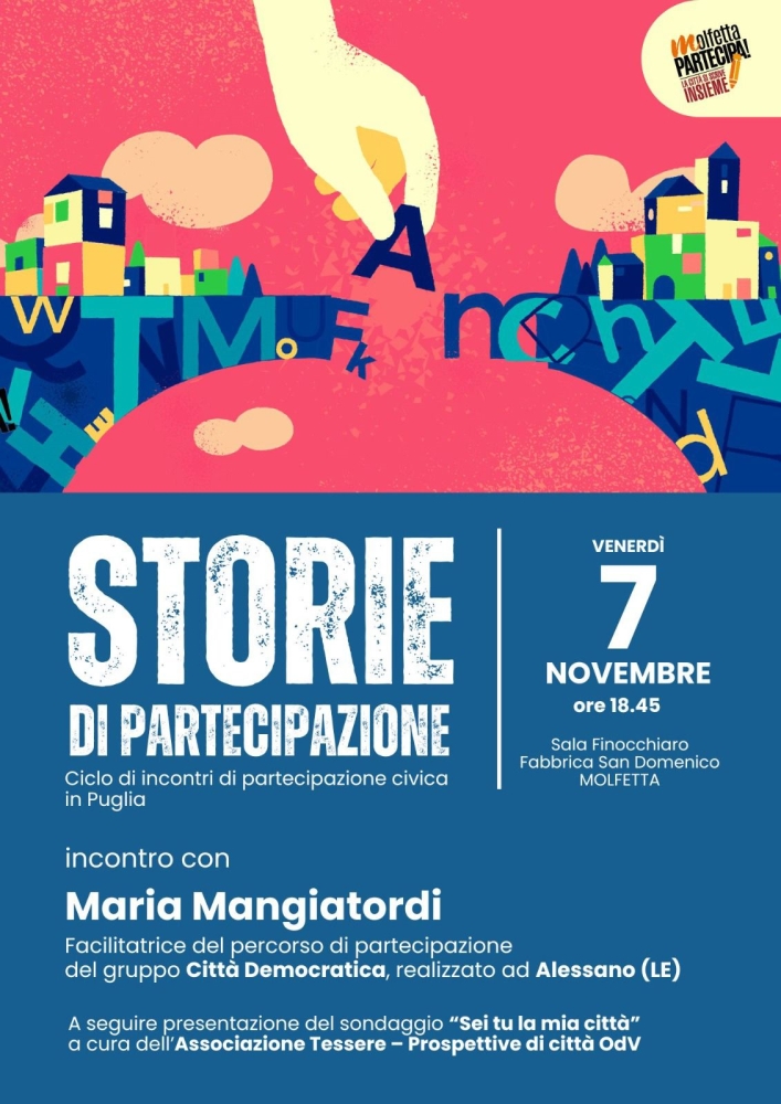 MOLFETTA - Il Forum Molfetta Partecipa prosegue con il progetto “Storie di partecipazione” per presentare alla città esperienze di partecipazione civica dal basso realizzate in città pugliesi e che hanno rappresentato pagine belle di partecipazione dei cittadini e delle associazioni alla vita politica delle proprie città.