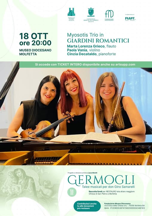 e FEART società cooperativa. Un progetto di Laura Binetti che offre uno scambio generoso di bellezza: bella musica per restituire lo splendore all’arte sacra. Concerti offerti generosamente dai musicisti che hanno conosciuto ed apprezzato l’impegno di don Gino Samarelli per la musica, per raccogliere fondi utili al restauro della tela di Nicola Porta raffigurante la Madonna con il bambino e i santi situata nella cavità absidale dell’altare maggiore della Chiesa di San Pietro a Molfetta. Il Myosotis Trio è una formazione cameristica composta da Marta Lorenza Grieco (flauto),