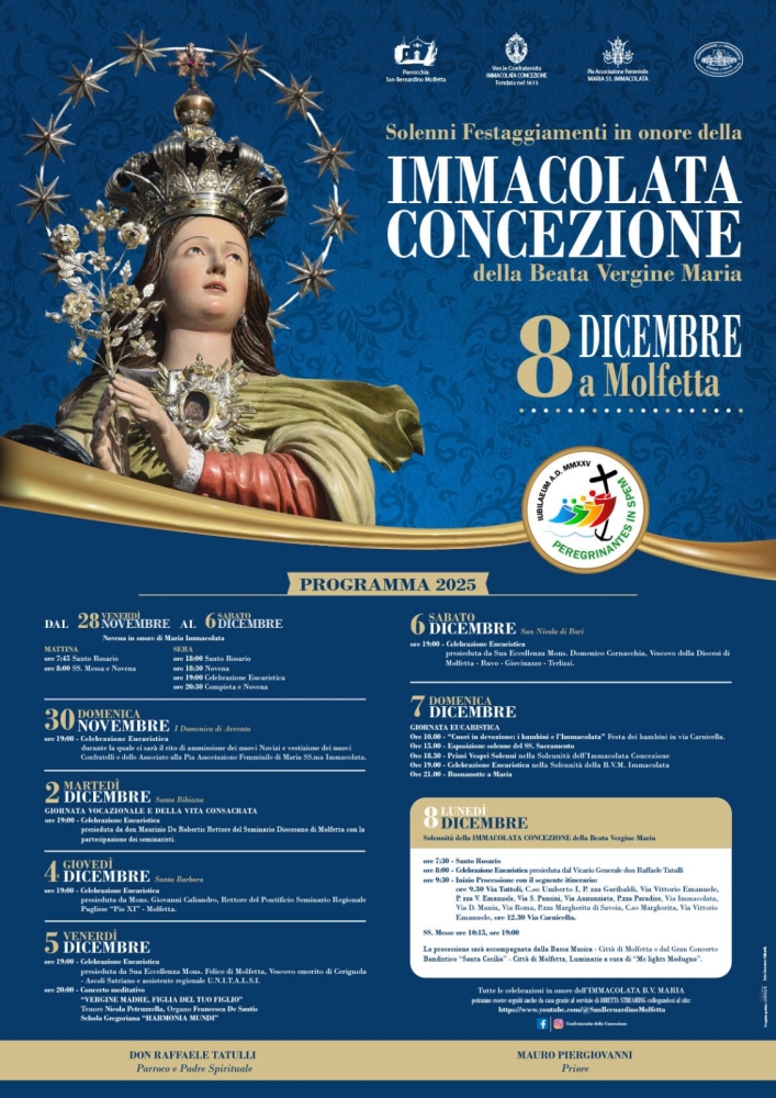 Altro momento importante sarà il solenne triduo, a partire da giovedì 4 dicembre, quando la Celebrazione Eucaristica sarà presieduta da Mons. Giovanni Caliandro, Rettore del Pontificio Seminario Regionale Pugliese “Pio XI”. Il 5 dicembre la Santa Messa sarà celebrata da Mons. Felice di Molfetta, Vescovo emerito di Cerignola - Ascoli Satriano e Assistente regionale UNITALSI. La serata si concluderà con il concerto “Vergine Madre, Figlia del Tuo Figlio”, con il tenore Nicola Petruzzella, la Schola Gregoriana Harmonia Mundi e l’organista Francesca De Santis. Il 6 dicembre, festa di San Nicola, la comunità accoglierà il proprio Vescovo, S.E. Mons. Domenico Cornacchia, che presiederà la Celebrazione Eucaristica.