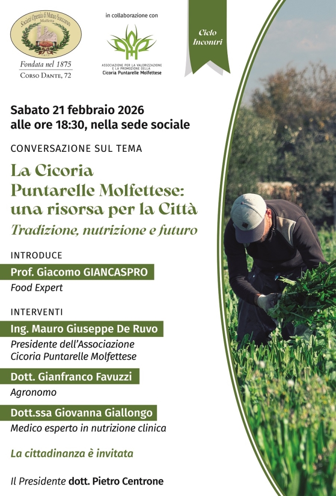 L’iniziativa rientra nella programmazione culturale e sociale promossa dalla Società operaia di mutuo soccorso, da tempo impegnata in un’azione di valorizzazione e crescita a tutti i livelli della comunità cittadina. È organizzata in collaborazione con l’Associazione per la valorizzazione della Cicoria Puntarelle Molfettese, da tempo all’opera per ottenere il riconoscimento IGP.