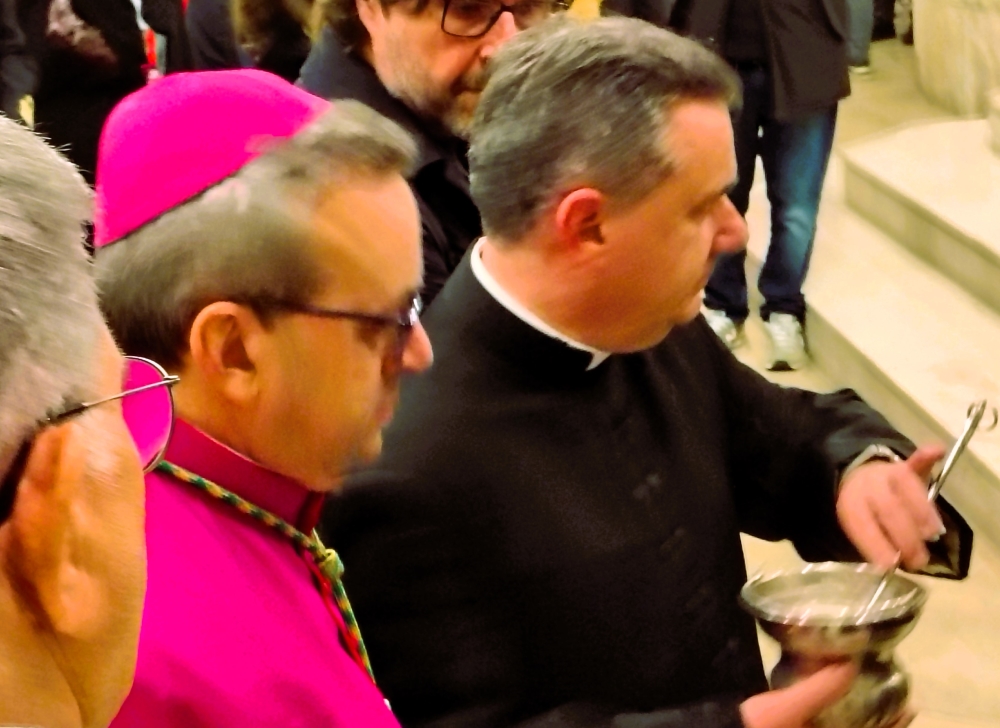 A seguire il gesto della venerazione del Crocifisso, presentato a Mons. Basile dall’arcidiacono del Capitolo Cattedrale Mons. Ignazio De Gioia, il segnarsi con l’acqua santa, l’aspersione dell’assemblea e l’adorazione del SS.mo Sacramento.