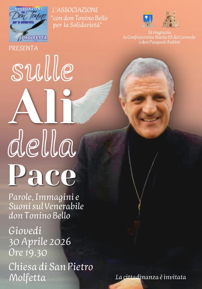 MOLFETTA - L'associazione “Con Don Tonino Bello per la solidarietà” di Molfetta organizza l’iniziativa “Sulle ali della pace, parole immagini e suoni sul venerabile Don Tonino Bello”.