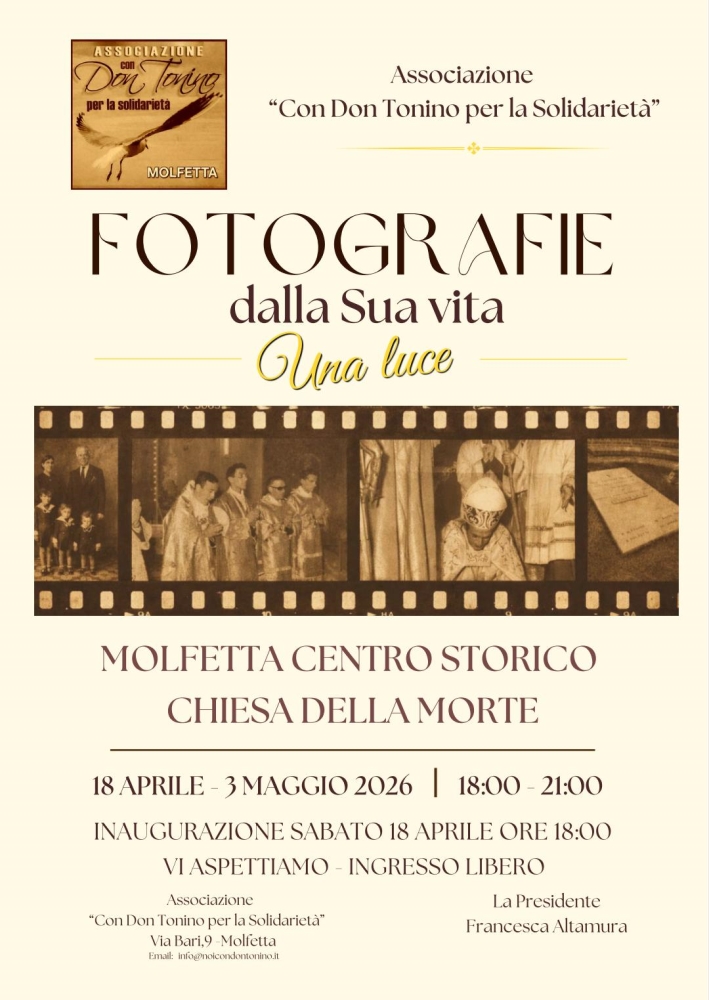 MOLFETTA - L'associazione “Con Don Tonino per la solidarietà” organizza la mostra di fotografie “Una luce” sulla vita del vescovo venerabile