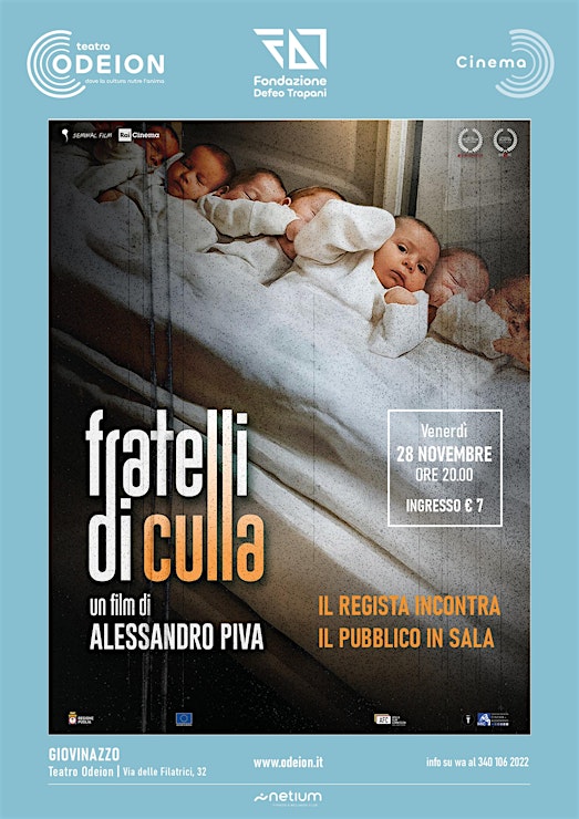 - Venerdì 28 novembre il Teatro Odeion di Giovinazzo ospita un imperdibile evento cinematografico fuori cartellonegv. La proiezione del docu-film “Fratelli di Culla” di Alessandro Piva, presentato in concorso al BIF&ST - Bari International Film Festival 2025. La straordinaria, seppur poco nota, storia del brefotrofio di Bari diventa un’interessante riflessione sul ruolo della donna nella società italiana e pugliese, dagli anni ‘50 ad oggi. Il regista barese, reso noto al grande pubblico per film diventati “cult” come La capagira (1999) e Mio cognato (2002) sarà presente in sala e interagirà con il pubblico, rispondendo alle domande dopo la proiezione. Ticket ingresso € 7 Consigliato acquisto preventivo del biglietto: - presso il botteghino del teatro Odeion (contattare il nr. 340 1062022) - online su Eventbrite a questo link: