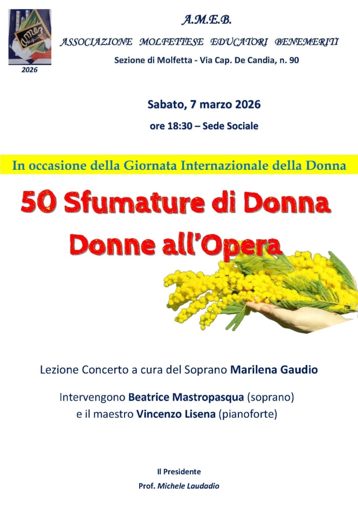 MOLFETTA - L’AMEB (Associazione Molfettese Educatori Benemeriti), presieduta dal prof. Michele Laudadio, ha organizzato per sabato 7 marzo 2026 nella sede sociale in Via Cap. De Candia n.90 una lezione concerto condotta dal soprano Marilena Gaudio e denominata “50 sfumature di donna” – ovvero Donne all’opera per commemorare la Giornata Internazionale della Donna, istituita per ricordare le conquiste sociali,