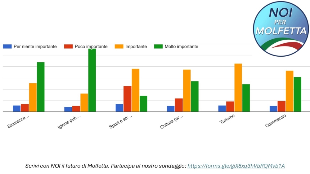 – Il Movimento civico “NOI per Molfetta” ha fatto un sondaggio fra i cittadini sull’amministrazione Minervini, sulla sospensione del sindaco o e sulle dimissioni sue e degli assessori, sulle priorità, sulla sicurezza, sulla pulizia della città. Emerge un quadro di scontento complessivo che dovrebbe far riflettere gli amministratori attaccati alle poltrone e agli stipendi. Ecco il comunicato di “noi per Molfetta e del coordinatore cittadino Ing. Michele la Grasta. «A poco più di due mesi dal lancio del sondaggio promosso dal Movimento Civico “NOI per Molfetta”, sono stati raccolti i primi risultati. Dai primi questionari compilati dai cittadini (alcune centinaia quelli già raccolti) emerge netta la presa di posizione nei confronti della amministrazione comunale. Ma andiamo per gradi. Alla prima domanda, su quali fossero secondo i cittadini le priorità per la Città, spiccano tra le altre risposte proposte, in ordine di preferenza: “igiene pubblica”, “cura e manutenzione delle coste”, “opere di urbanizzazione”, “Sicurezza”, “raccolta differenziata”, “socialità”. Alla seconda domanda, su quanto i cittadini si ritengono soddisfatti dell’amministrazione Minervini (potendo esprimere un giudizio con un voto da 0 a 10) il 79.5% dei cittadini esprime un giudizio negativo (inferiore alla sufficienza). Se a questi si sommano quelli che hanno espresso un giudizio appena sufficiente (voto 6) si arriva al 90.7%. Ben l’87.3% dei cittadini che hanno partecipato sinora al sondaggio ritiene che questa amministrazione debba dimettersi. Il che significa quindi che anche alcuni tra i sostenitori di questa amministrazione hanno un giudizio appena sufficiente del suo operato e, viceversa, che anche alcuni di quelli che hanno un giudizio sufficiente dell’operato di questa amministrazione ritenga sia bene che gli attuali governanti della città rassegnino le dimissioni. Numerosi e davvero molto interessanti gli spunti forniti dai cittadini sulle varie tematiche proposte. Molti di questi spunti saranno alla base del nostro programma elettorale. Intendiamo coinvolgere sempre più i cittadini per scrivere insieme il futuro della città. Il sondaggio rimarrà aperto sino alla stesura del programma elettorale per le prossime elezioni amministrative; si può fornire il proprio contributo di idee cliccando al seguente link: