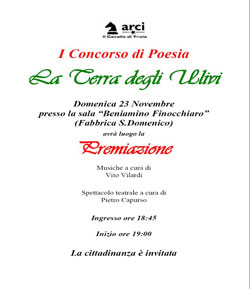 MOLFETTA - Domenica 23 novembre alle ore 19, presso la Fabbrica S. Domenico (sala Finocchiaro), avrà luogo la premiazione del primo concorso di poesia "La terra degli ulivi".