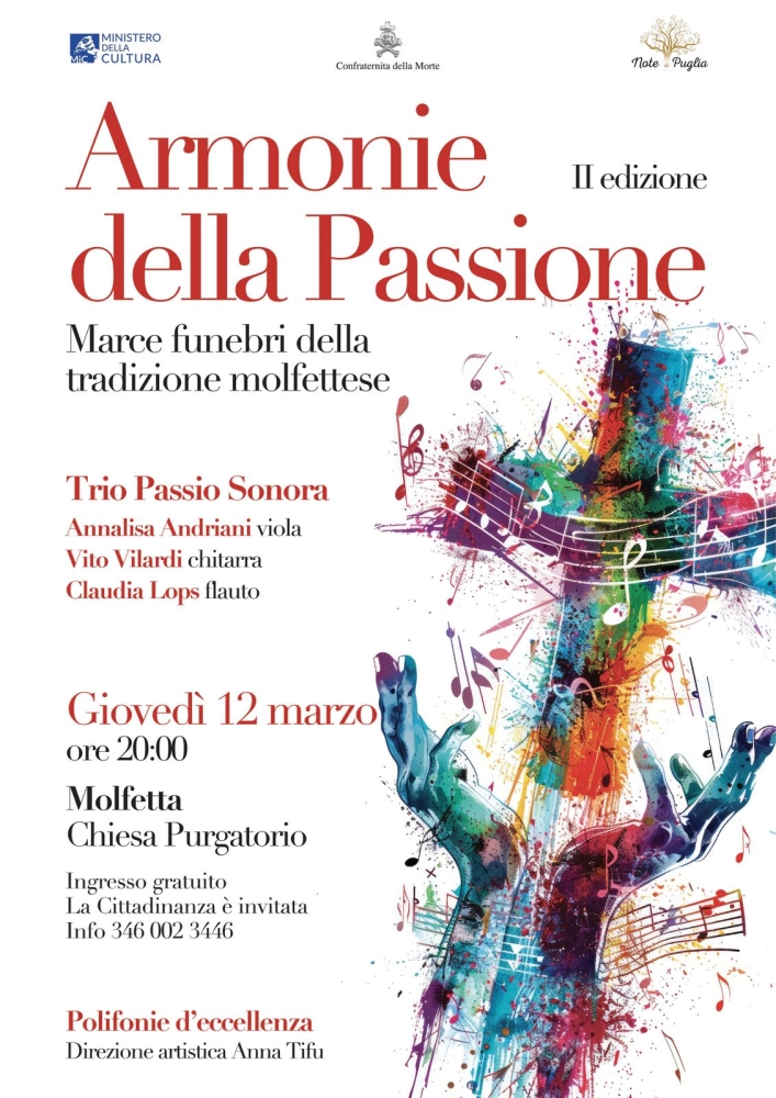 MOLFETTA - L’Associazione Note di Puglia presenta la seconda edizione di Armonie della Passione, appuntamento inserito nella stagione concertistica Polifonie d’Eccellenza, in programma il 12 marzo alle ore 20 presso la Chiesa del Purgatorio di Molfetta.