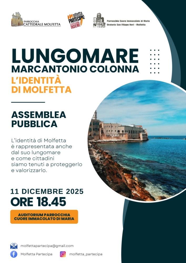 MOLFETTA - Informare la cittadinanza su cosa prevede il progetto della vasca di colmata da realizzarsi sul nostro lungomare è l'obiettivo perseguito dal Forum Molfetta Partecipa in collaborazione con le Parrocchie Cattedrale di Molfetta e Cuore Immacolato di Maria nell’assemblea pubblica dal titolo: “Lungomare “Marcantonio Colonna”: l’identità di Molfetta” convocata giovedì 11 dicembre 2025 alle ore 18.45 presso l’Auditorium Parrocchia Cuore Immacolato di Maria.