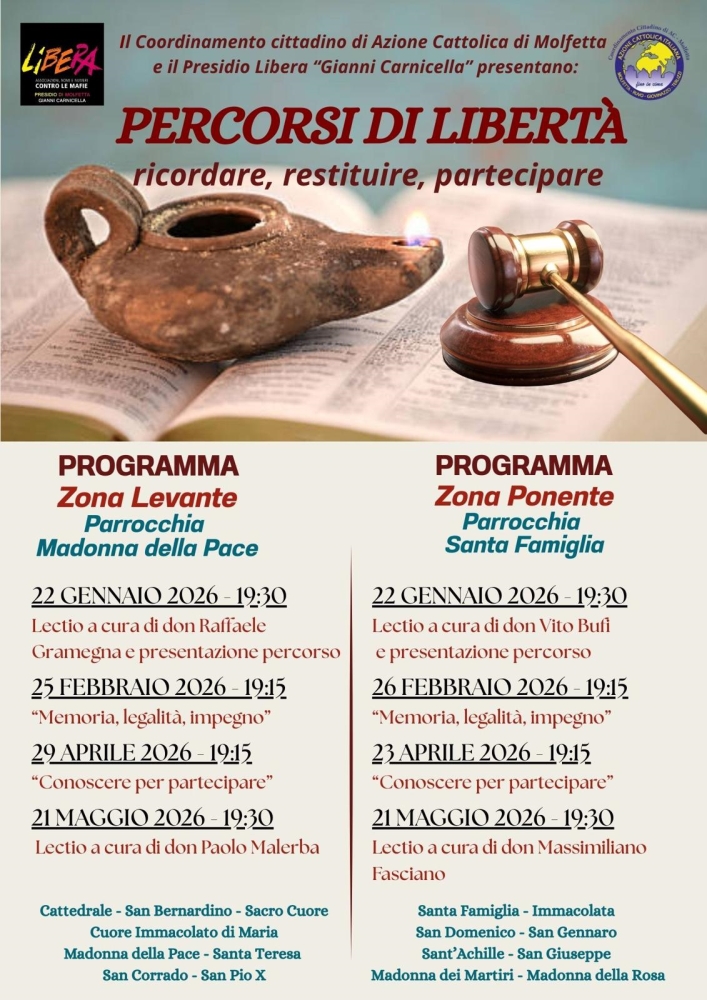MOLFETTA - Il Coordinamento Cittadino di Azione Cattolica di Molfetta, in collaborazione con il Presidio cittadino di Libera “Gianni Carnicella”, promuove un Percorso sulla Legalità rivolto a giovani, adulti e aperto a tutta la cittadinanza.