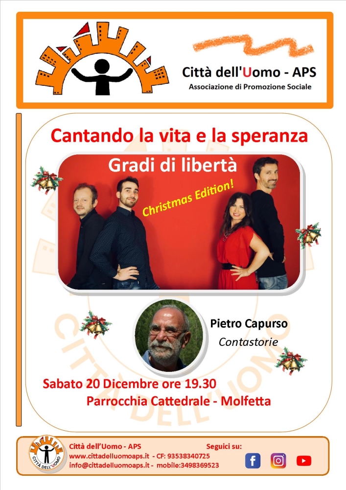 MOLFETTA - A conclusione dell'anno l’associazione Città dell’Uomo di Molfetta ripropone con la serata: “Cantando la vita e la speranza” un percorso con canti natalizi e meditazioni all’insegna della speranza e della spensieratezza.