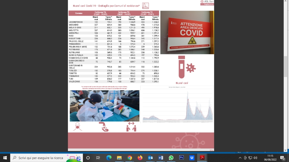 BARI - L’andamento dei casi Covid nel territorio di Bari e provincia permane in discesa per la quarta settimana consecutiva. Nel periodo tra fine luglio e inizio agosto, le nuove positività rilevate ammontano a 7.922, pari a un tasso settimanale di 644 casi ogni 100mila abitanti, con un calo del 30,1% rispetto alla settimana precedente e un’incidenza più che dimezzata (-53,1%) nel confronto con il tasso d’inizio luglio (1.375,9 ogni 100mila abitanti).