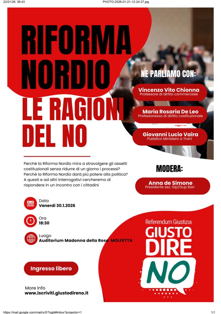 MOLFETTA - In prospettiva del prossimo appuntamento referendario, il Comitato Nazionale a difesa della Costituzione per il NO – Articolazione di Bari organizza un incontro-dibattito, venerdì 30 gennaio, alle ore 18.30, presso l’Auditorium della Parrocchia Madonna della Rosa a Molfetta in viale Papa Giovanni Paolo II, 121.