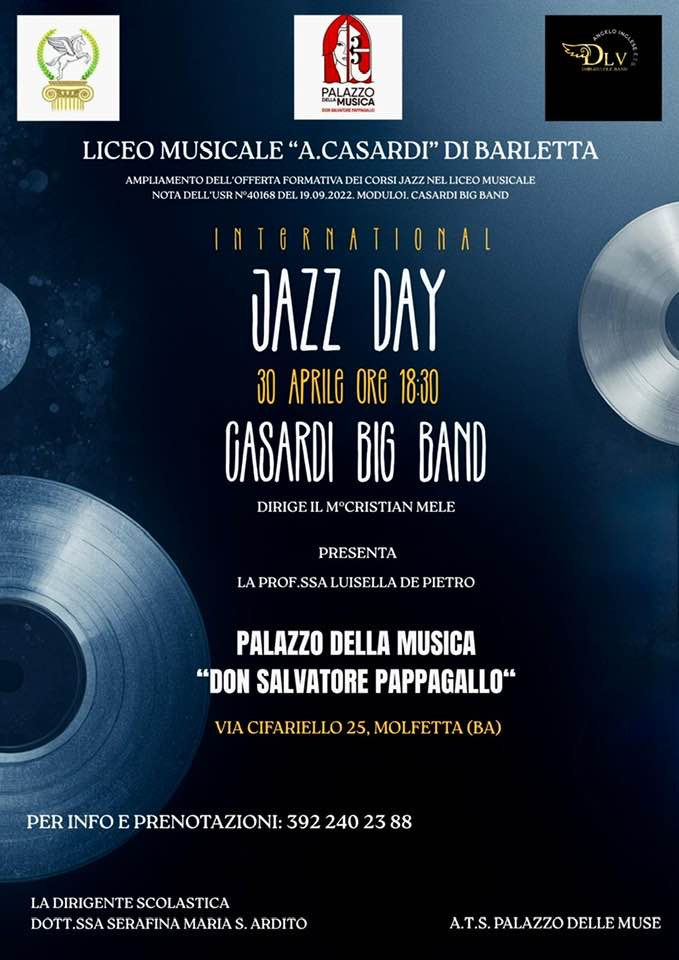 MOLFETTA - Giovedì 30 aprile il Liceo musicale Casardi con la sua Big Band, si prepara a celebrare la giornata mondiale del jazz. L’evento, reso possibile grazie all’ampliamento dell’offerta formativa dei corsi jazz nel Liceo Musicale ed ad un protocollo d’intesa con l’associazione culturale A.T.S. Palazzo delle Muse di Molfetta, vedrà protagonisti i ragazzi del Liceo Musicale “A. Casardi” diretti dal M°Cristian Mele docente di Sassofono presso lo stesso Liceo.
