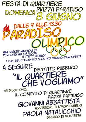 All’interno della Festa ci sarà uno spazio riservato al “Paradiso Olimpico”: dalle 9 alle 13:30 la piazza si riempirà di strutture sportive, tra le quali canestri per il minibasket, reti per il minivolley e percorsi ad ostacoli, messe a disposizione dal CSI (Centro Sportivo Italiano) Molfetta, volte ad offrire ai ragazzi e alle ragazze del quartiere una giornata di sport e di sano divertimento.