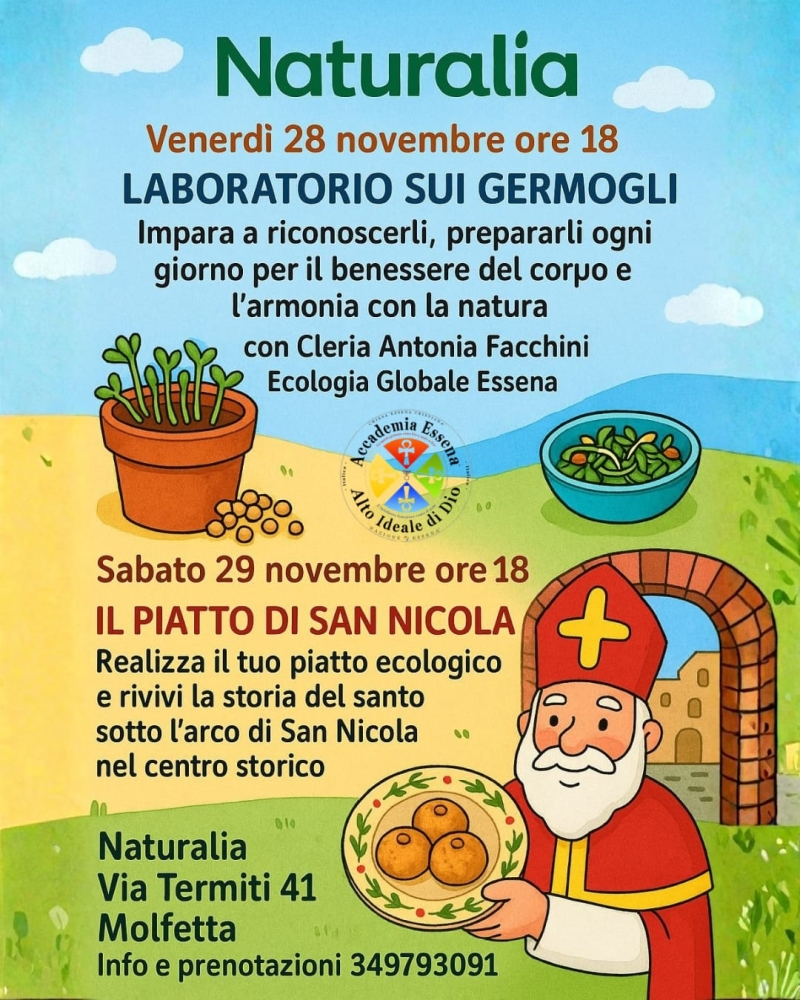 MOLFETTA - Naturalia propone due nuovi appuntamenti rivolti a famiglie, adulti e bambini, per promuovere uno stile di vita più consapevole e in armonia con la natura e per rivivere le nostre tradizioni di San Nicola, il santo dei bambini.