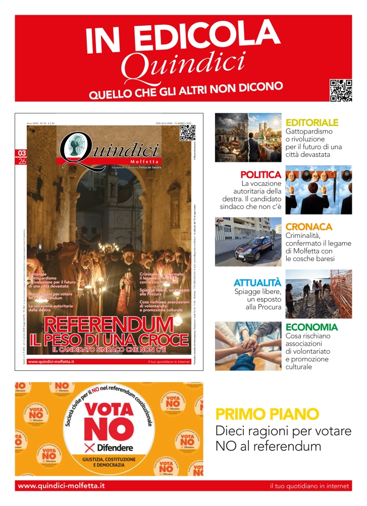 Dieci ragioni per votare NO al referendum; La vocazione autoritaria della destra; Criminalità, confermato il legame di Molfetta con le cosche baresi; Spiagge libere, un esposto alla Procura; Cosa rischiano associazioni di volontariato e promozione culturale. La Settimana Santa nelle immagini di Mauro Germinario.