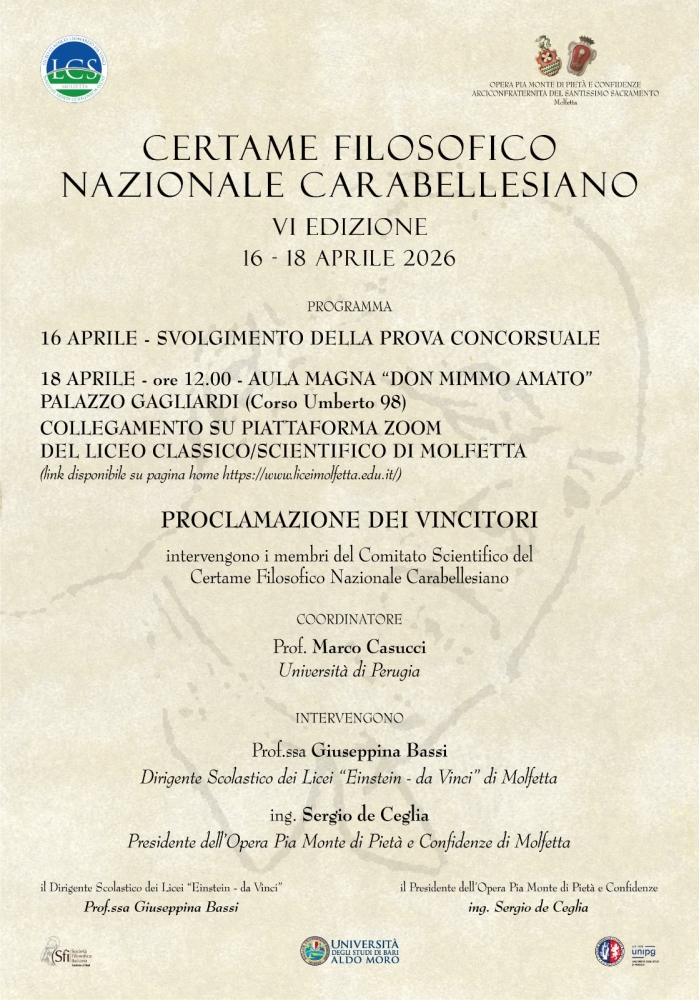 – Torna a Molfetta la sesta edizione del Certame Filosofico Nazionale Carabellesiano, un appuntamento accademico di rilievo dedicato all'approfondimento del pensiero del filosofo Pantaleo Carabellese. L'evento si svolgerà dal 16 al 18 aprile. L'iniziativa è promossa dai Licei Classico-Scientifico “Einstein/Da Vinci” di Molfetta, diretti dalla Prof.ssa Giuseppina Bassi, e dall’Opera Pia Monte di Pietà e Confidenze di Molfetta, presieduta dall’Ing. Sergio de Ceglia. Il Certame vanta il prestigioso patrocinio dell’Università degli Studi di Bari, dell’Università degli Studi di Perugia e della sezione barese della Società Filosofica Italiana.