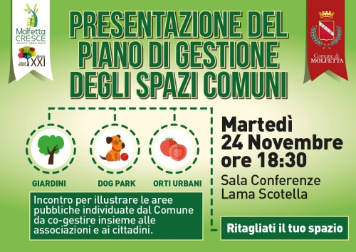 Domani alle ore 18.30 nella sala conferenze di lama scotella incontro pubblico di presentazione delle aree e delle modalità di gestione condivisa degli spazi comuni in città