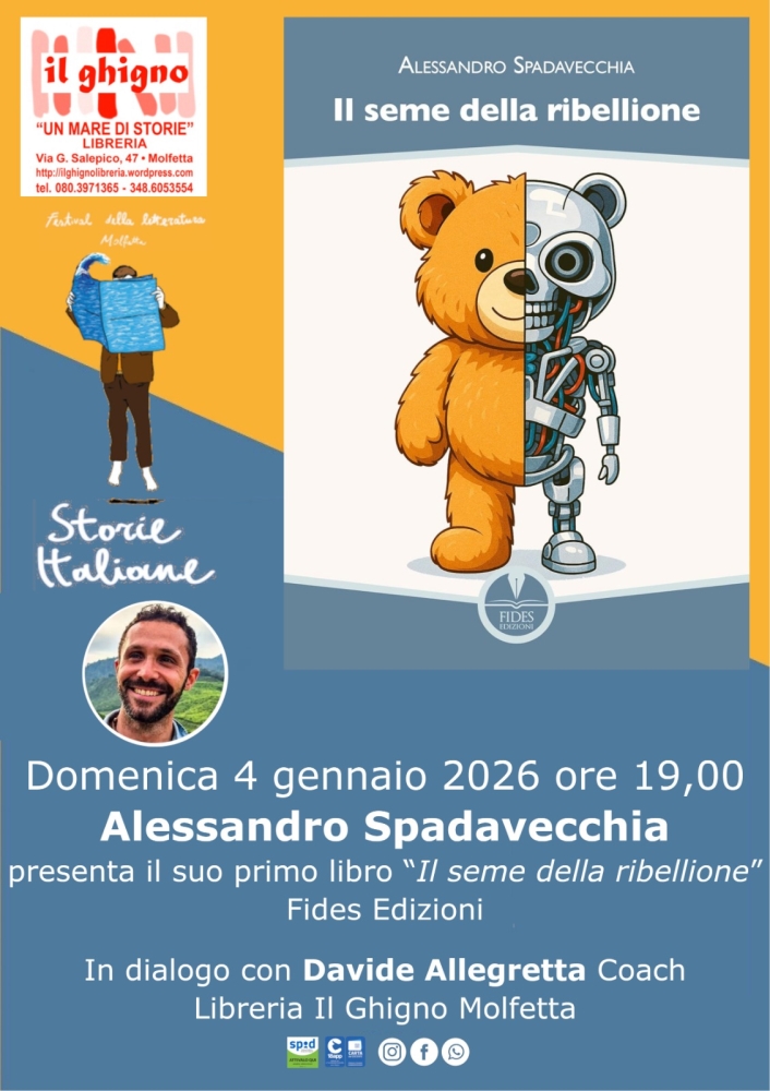 Domenica 4 gennaio 2026 ore 19 Alessandro Spadavecchia presenta il suo primo libro “Il seme della ribellione” Fides Edizioni in dialogo con Davide Allegretta Coach, ingresso libero.