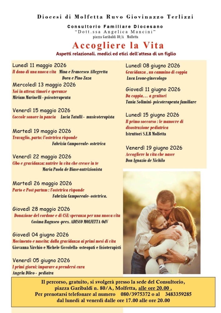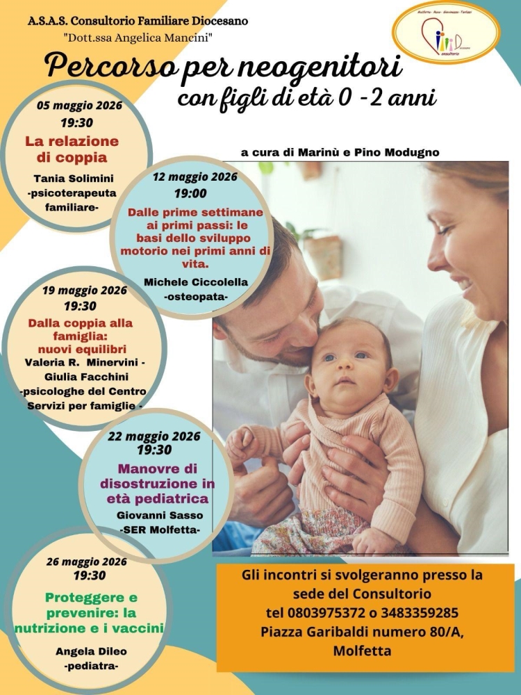 MOLFETTA - Il Consultorio Familiare Diocesano “Dott.ssa Angelica Mancini” propone un nuovo percorso dedicato ai neogenitori con figli da 0 a 2 anni, un ciclo di incontri pensato per accompagnare le famiglie nei primi delicati anni di vita del bambino.