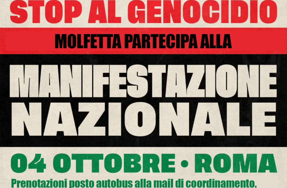 Lo sciopero del 22 settembre ci ha mostrato che le nostre forze, quando unite in un movimento collettivo, possono fare pressione e raggiungere risultati concreti: lo dimostrano le ultime azioni del ministro della Difesa e le prime dichiarazioni — seppur ancora balbettanti e superficiali — estorte al governo e alle istituzioni dalle piazze gremite di tutta Italia. Tra i diecimila scesi in strada a Bari lo scorso lunedì di sciopero generale c’era chi riscopriva la gioia di un corteo dopo anni di inverno politico al fianco di chi, magari per la prima volta, calcava strade consuete in modo nuovo, con migliaia di sconosciuti che diventano improvvisamente familiari, amici, compagne. Individui che si sorprendono comunità, scintille che brillano e accendono fuochi che non bruciano ma riscaldano, fiamme che illuminano. I prossimi giorni saranno cruciali, e siamo chiamati come movimento di terra a favore della Palestina a tornare in piazza e sostenere le nostre sorelle e i nostri fratelli in mare e dall’altra parte del Mediterraneo. Per questo motivo invitiamo tutte e tutti coloro che hanno seguito e sostenuto il coordinamento a unirsi a noi nella grande manifestazione nazionale del 4 ottobre 2025 a Roma, in cui convergeremo da tutta Italia per dare sostegno al movimento nel momento di maggiore necessità. Come coordinamento cittadino abbiamo preparato un autobus in partenza da Molfetta all’alba di sabato mattina, con ritorno previsto in serata da Roma, per vivere questo momento storico insieme in maniera pacifica e sicura, manifestando assieme alla nostra comunità cittadina per le strade della capitale. Il costo del viaggio è di circa 30 euro a/r, da prenotare il prima possibile a causa dei posti limitati e della grande richiesta. Prima e durante il viaggio per Roma sarà distribuita a tutte e tutti i partecipanti una guida con le informazioni e i suggerimenti necessari per poter manifestare in sicurezza e tranquillità. Per prenotare il vostro posto invitiamo a scrivere alla mail di coordinamento