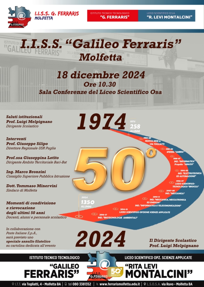 MOLFETTA - L’I.I.S.S. “Galileo Ferraris” di Molfetta si appresta a festeggiare un importante traguardo, il 50° anniversario della sua istituzione, avvenuta nel 1974. Mercoledì 18 dicembre si terrà la cerimonia commemorativa presso la sala Conferenze del Liceo Scientifico OSA “Rita Levi Montalcini” a partire dalle ore 10.30.