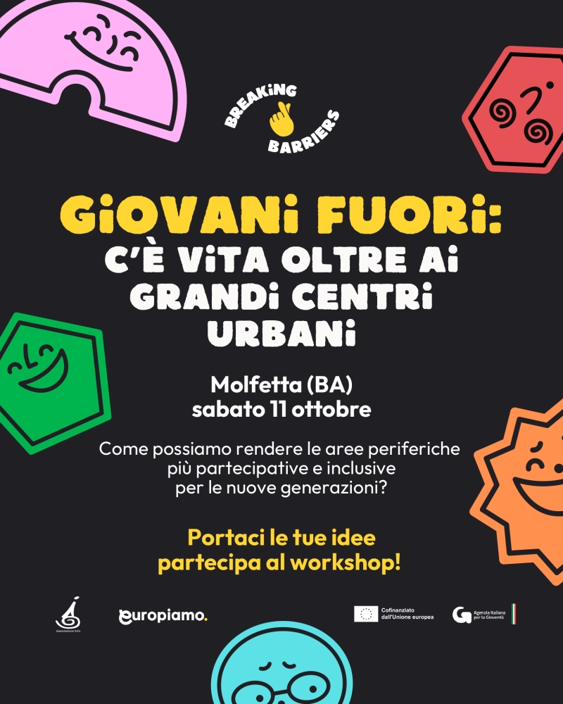 - Sabato 11 ottobre, InCo Molfetta ed Europiamo ospiteranno il workshop “Giovani fuori: c’è vita oltre i grandi centri urbani”, un incontro pensato per connettere giovani under 30 e policy maker da Puglia, Basilicata, Molise e dintorni con l’obiettivo di confrontarsi e scoprire buone pratiche per stimolare la partecipazione delle nuove generazioni nelle aree periferiche e rurali. Passeremo una giornata insieme al fine di condividere idee e proposte per rafforzare la presenza giovanile nei processi decisionali e di sviluppo locale. L’evento è parte del progetto “Breaking Barriers”, una attività di partecipazione giovanile, finanziata attraverso il programma Erasmus+. La tappa di Molfetta si inserisce all’interno di un percorso che ha coinvolto decine di città da Nord a Sud della Penisola, affrontando i principali temi riguardanti l’inclusione delle nuove generazioni nei processi partecipativi. Cosa faremo a Molfetta?