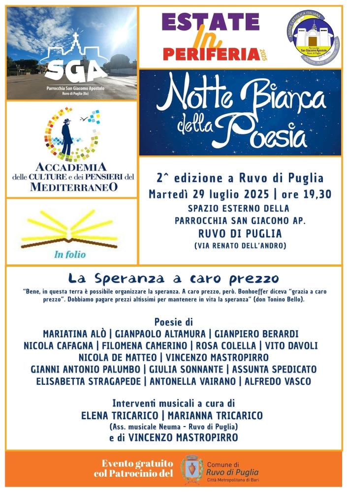 RUVO DI PUGLIA - Si rinnova per il secondo anno l’evento della Notte Bianca della Poesia a Ruvo di Puglia, promosso dall’Azione Cattolica della parrocchia San Giacomo, in collaborazione con l’Accademia delle Culture e dei Pensieri del Mediterraneo di Giovinazzo e con l’associazione culturale In folio - Associazione Culturale di Ruvo di Puglia, con il Patrocinio del Comune di Ruvo di Puglia Assessorato alla Cultura.