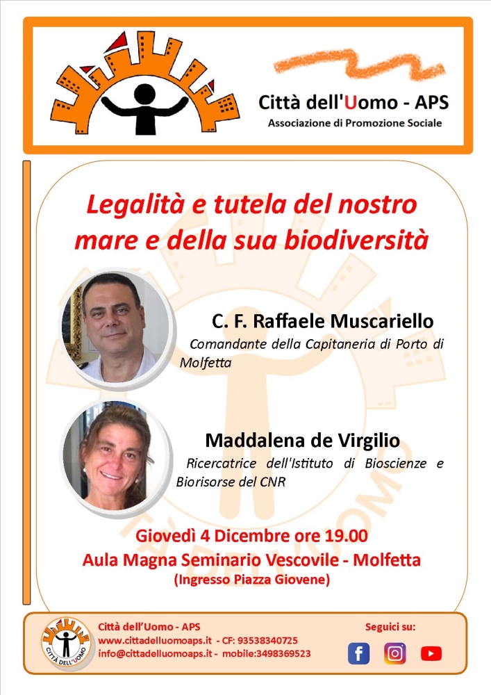 Per affrontare questi temi strettamente legati al nostro territorio ascolteremo gli interventi del Comandante della Capitaneria di Porto di Molfetta, C.F. Raffaele Muscariello e la dott.ssa Maddalena de Virgilio, ricercatrice dell’Istituto di Bioscienze e Biorisorse del CNR.
